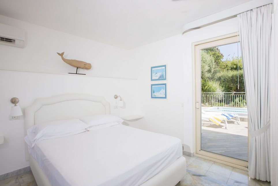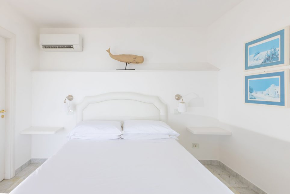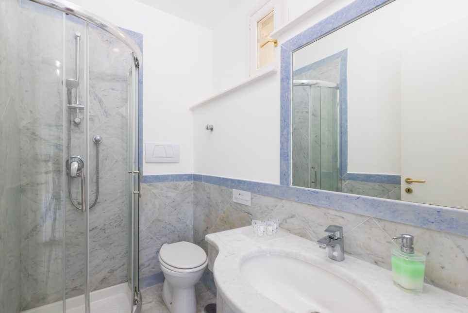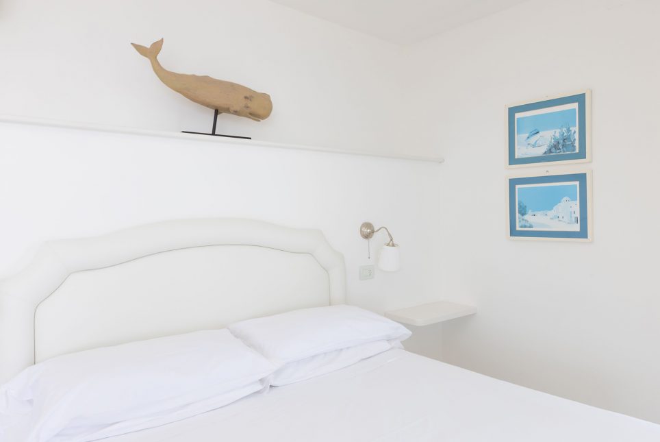 The crisp palette of spotless white and nautical blue gives Luly an open, airy feel and the soft grey and marble floors, kitchen, and bathroom are a touch of luxury.